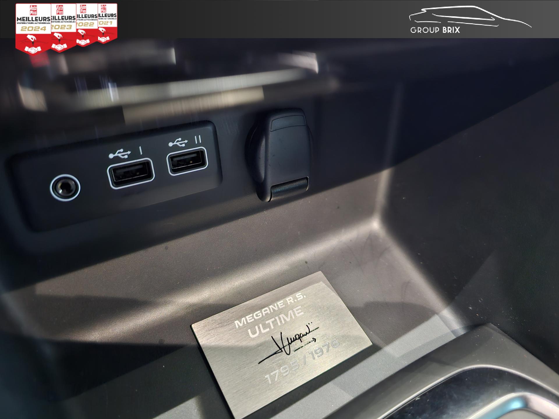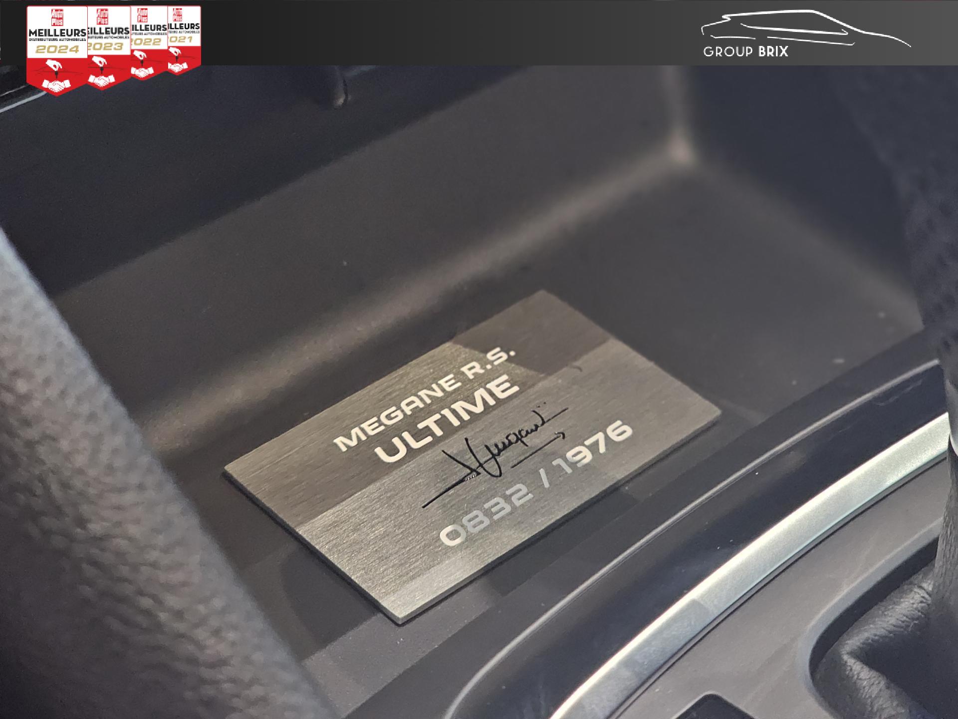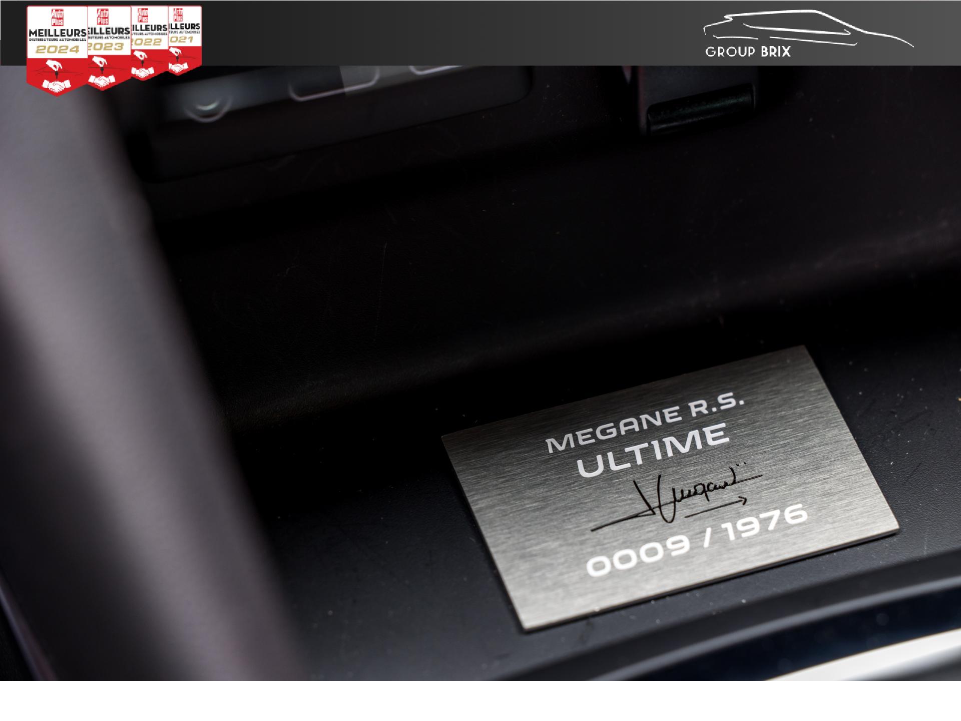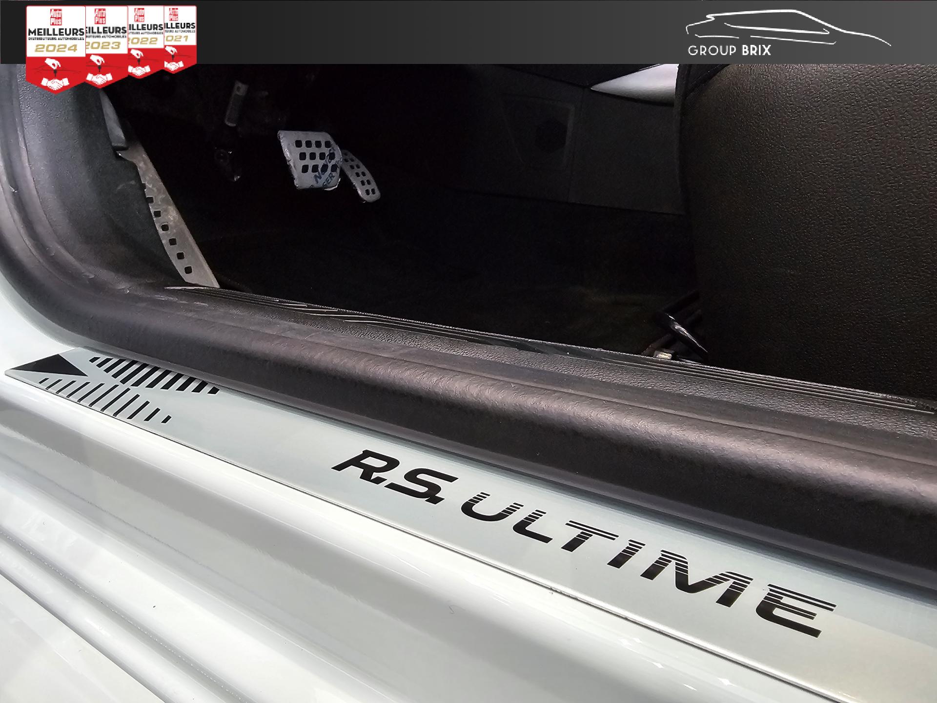 Aide au parking avant, arrière et latéralAiles arrière élargies R.S.Apple CarPlay sans fil et Android Auto filaireBadge mains-libres blanc avec losanges et marquage R.S. Ultime noirsBecquet arrière R.S.Bouclier avant spécifique élargi avec lame F1 noir brillant avec stripping UltimeBouton d’activation R.S. driveCaméra de reculCompteur TFT 10” reconfigurable avec matrice couleurJantes alliage 19" Fuji LightPlaque numérotée (entre 1 et 1976) R.S. Ultime signée par Laurent HurgonProjecteurs avant Full LED PURE VISION avec clignotant C-Shape intégréProjecteurs R.S. VISION Full LED 3 fonctions (antibrouillard, cornering, longue portée)R.S. MonitorAffichage tête haute Régulateur de vitesse adaptatifSièges avant Recaro avec sellerie Alcantara R.S. avec surpiqûres rouges, noires et gris techniqueSignature arrière R.S. noir avec double diamant, losange noir, et nom du modèle en noirStripping capot et toit noir matStripping écope arrière noir mat (côté gauche + côté droit)Système 4-control (Chassis à 4 roues directrices)Système d'échappement à clapetsSystème de Launch Control (Aide aux départs arrêtés)Système Multimédia EASY LINK avec écran tactile 9,3”