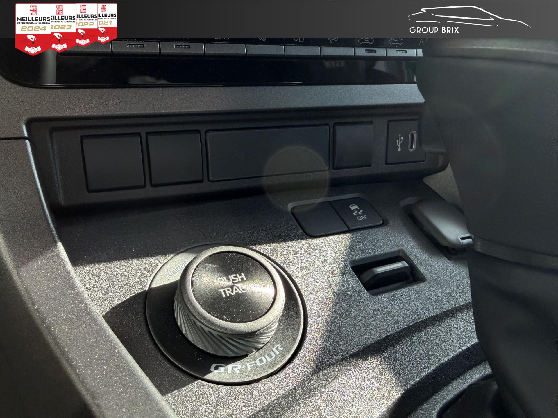3 modes de conduite ”GR-FOUR” : Normal / Gravel / Track4 modes de conduite “Toyota” : Eco, Normal, Sport, CustomClé digitaleClimatisation automatique bi-zoneCombiné d'instrumentation digital avec écran 12,3" TFTDifférentiel à glissement limité TorsenDouble sortie d'échappementPack refroidissement moteurProjecteurs Full LEDSystème d'ouverture / fermeture et démarrage sans clé “Smart Entry & Start”Système Toyota Safety Sense 3Transmission GR-FOUR