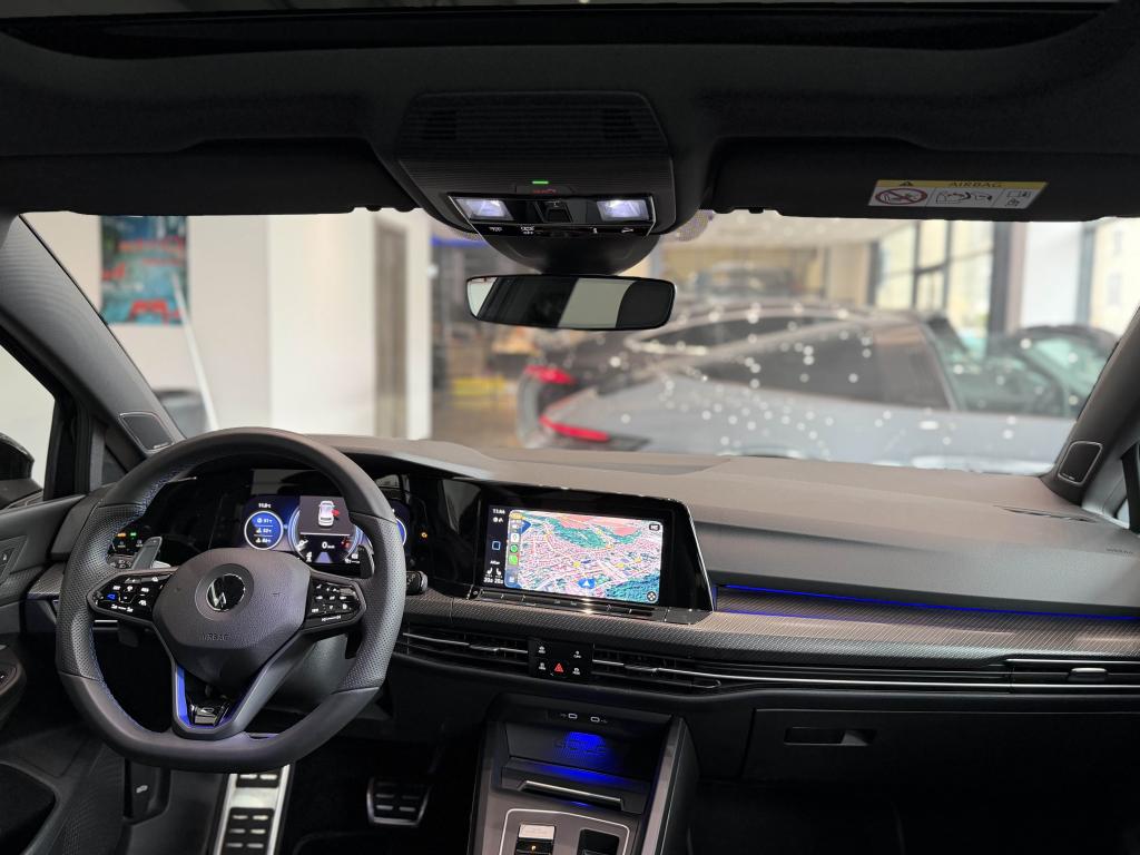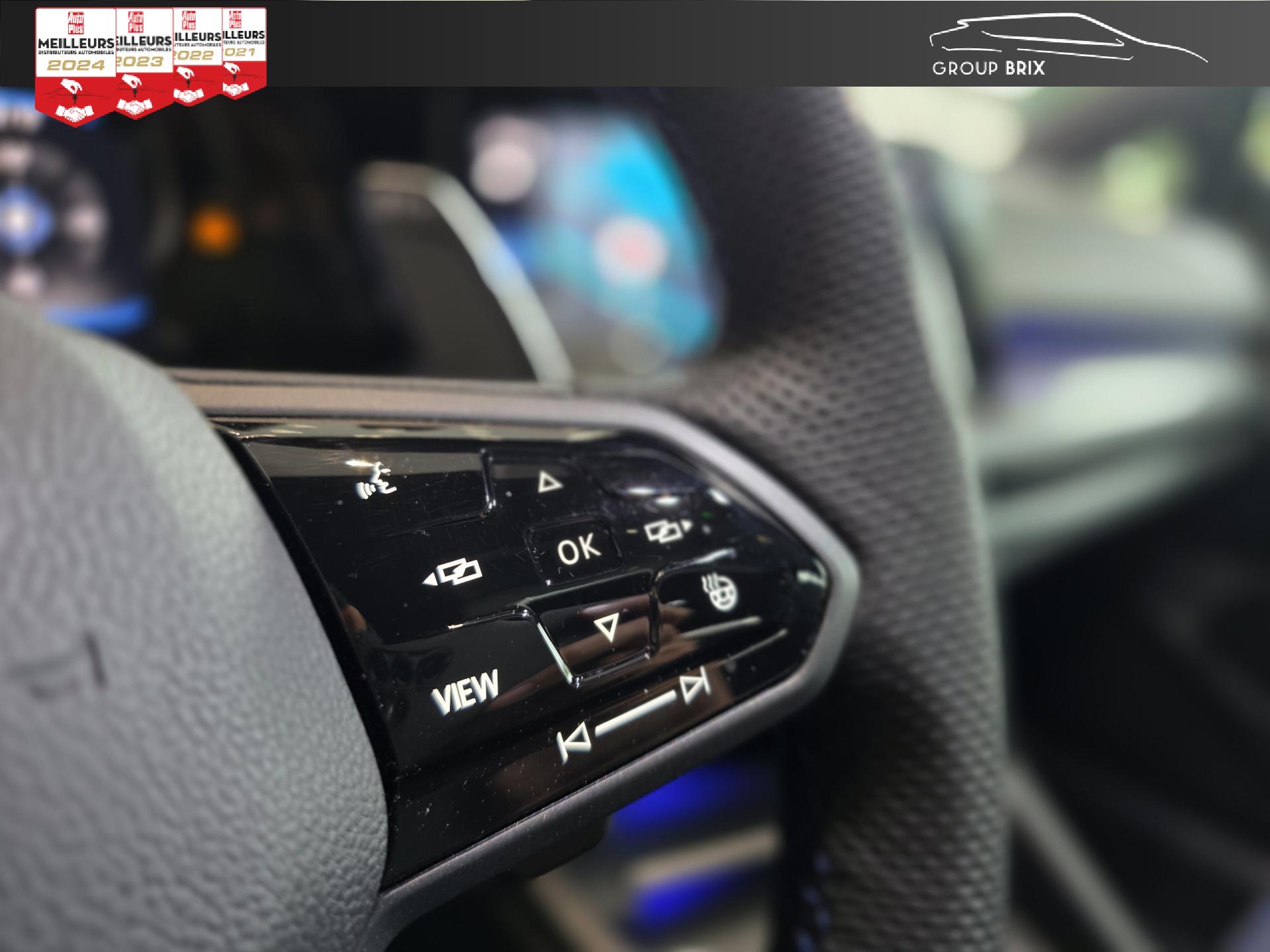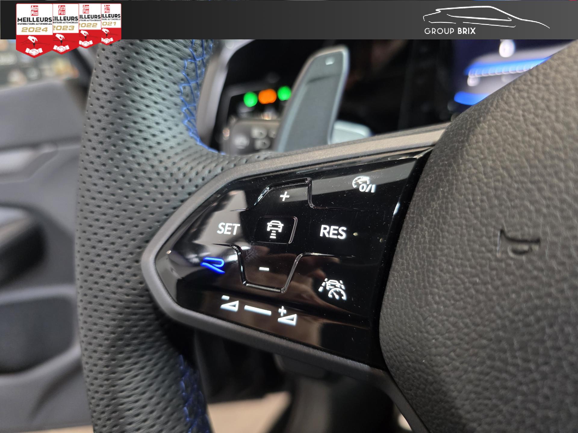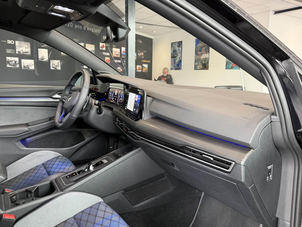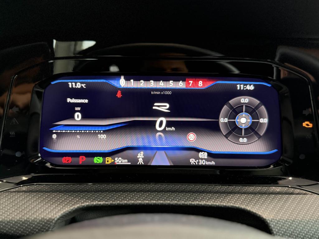 App-Connect sans filApplications décoratives "Carbon Grey" pour le tableau de bord et les revêtements de porte à l'avantCâble adaptateur USB-C vers USB-ACiel de pavillon noir soulDigital Cockpit Pro avec ‘R-View’ permettant d’afficher : puissance, couple, pression de suralimentation, compte-tours et accélèromètreDirection progressive spécifique ‘R'Eclairage à LED de la plaque d'immatriculation arrièreEclairage d'ambiance - 30 couleurs et éclairage de plancher à l'avantMonogrammes ‘R’ sur la calandre et le hayon, badges ‘R’ sur les ailes avantPack visibilitéPare-chocs avant et arrière spécifiques ‘R'Park Assist : Système d'assistance au stationnement en créneau et en batailleParkPilot : Système d’aide au stationnement avant/arrière avec signaux sonores et visualisation de la distance des obstacles sur l’écranPédalier et repose-pied en acier inoxydable brosséProjecteurs IQ.Light - Matrix LEDRégulateur de vitesse adaptatif et prédictif 'ACC' jusqu’à l’arrêt completSélection du profil de conduiteSièges sport à l’avant spécifiques ‘R’ avec appuis-tête intégrés, sellerie en tissu ‘Sardegna’ et microfleece ‘ArtVelours'Sign Assist: Reconnaissance des panneaux de signalisation et affichage sur le ‘Digital Cockpit’ et l’écran du système de radionavigationTransmission ‘4MOTION’ avec repartition vectorielle de couple ‘R-Performance’XDS : Système agissant comme un différentiel autobloquant électronique permettant une meilleure motricité en courbe grâce à une répartition optimale de la puissance et du couple sur les roues avant